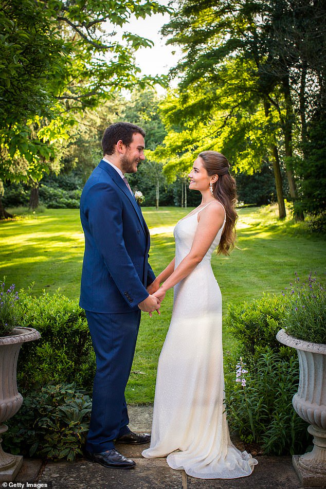 Gabriel, 23, wore a navy suit for the simple but stunning wedding while winzenried wore an elegant cream gown with seahorse earrings to the july 17 nuptials.